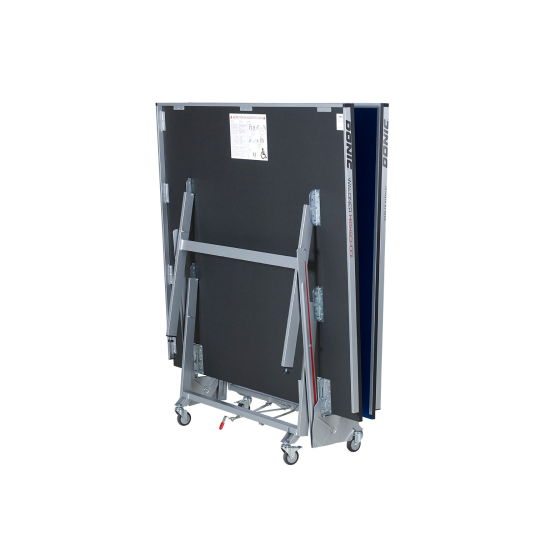 Konstruktionen bygger på Donics smidiga Super-Compact-system där båda bordshalvorna fälls upp samtidigt, vilket gör uppställning och förvaring enkel och säker. Den robusta stålramen och de låsbara hjulen gör bordet lätt att flytta, samtidigt som det står stabilt under spel.
